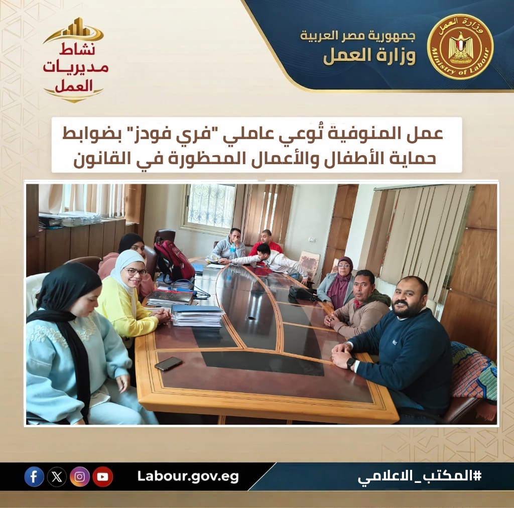 14 - "عمل المنوفية" تُوعي عمال "فري فودز" بضوابط حماية الأطفال والأعمال المحظورة في قانون العمل الجديد