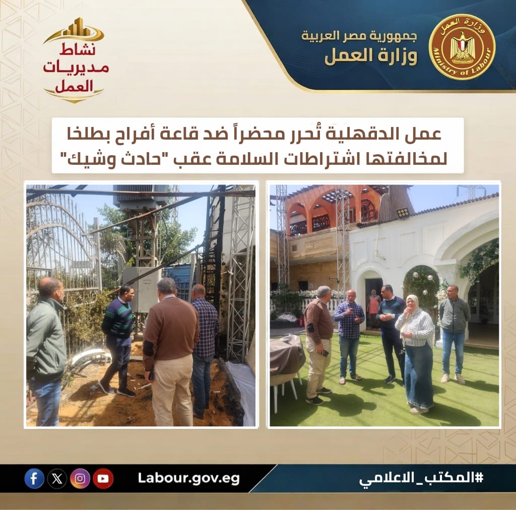 11-"عمل الدقهلية" تُحرر محضراً ضد قاعة أفراح بطلخا لمخالفتها اشتراطات السلامة عقب "حادث"