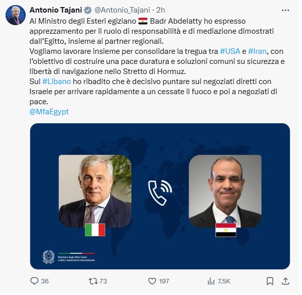 عبر وزير الخارجية الإيطالي أنطونيو تاياني، عن تقدير بلاده لجهود مصر إزاء جهود الوساطة من أجل تحقيق الاستقرار وتخفيف التوتر في منطقة الشرق الأوسط.