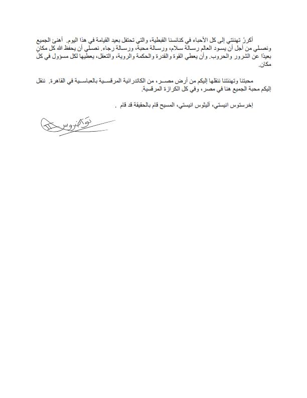 قدم قداسة البابا تواضروس الثاني، التهنئة لأبناءه في المهجر بعيد القيامة المجيد، وذلك من خلال الرسالة البابوية التي يرسلها لهم سنويًّا، في إطار دعم التواصل بين الكنيسة القبطية الأرثوذكسية وأبنائها في قارات العالم الخمس.