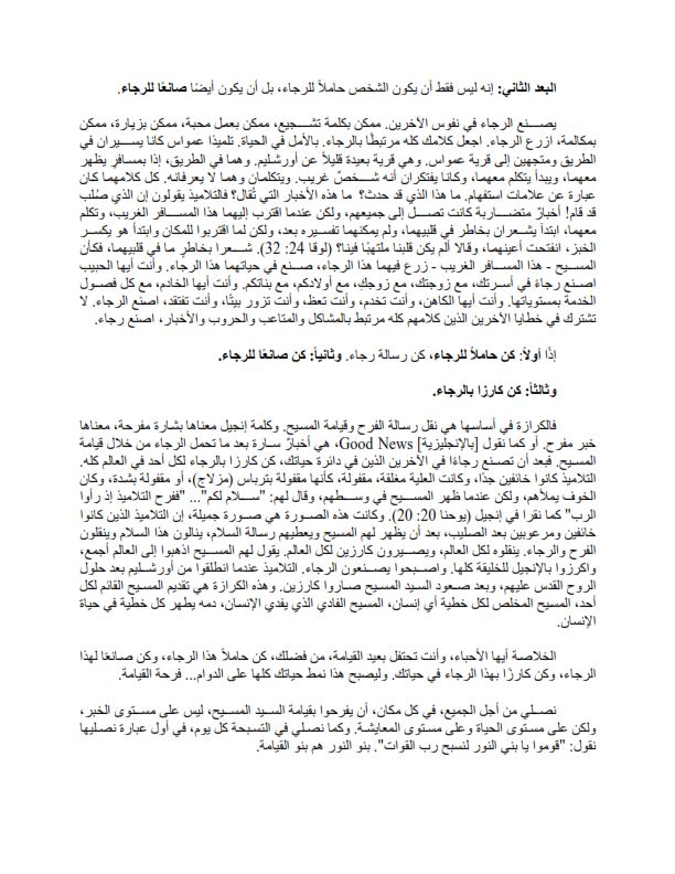 وتضمنت رسالة قداسة البابا الرعوية ثلاثة أبعاد تخص حياة الرجاء التي نلناها من خلال قيامة السيد المسيح، ونوه قداسته في بداية الرسالة الى أننا في زمن يمتلئ بالصراعات والحروب التي تدمر شعوبًا وأممًا، وتؤثر على حياة الأفراد والجماعات، وتؤثر على كل بيت في كل مكان في العالم.