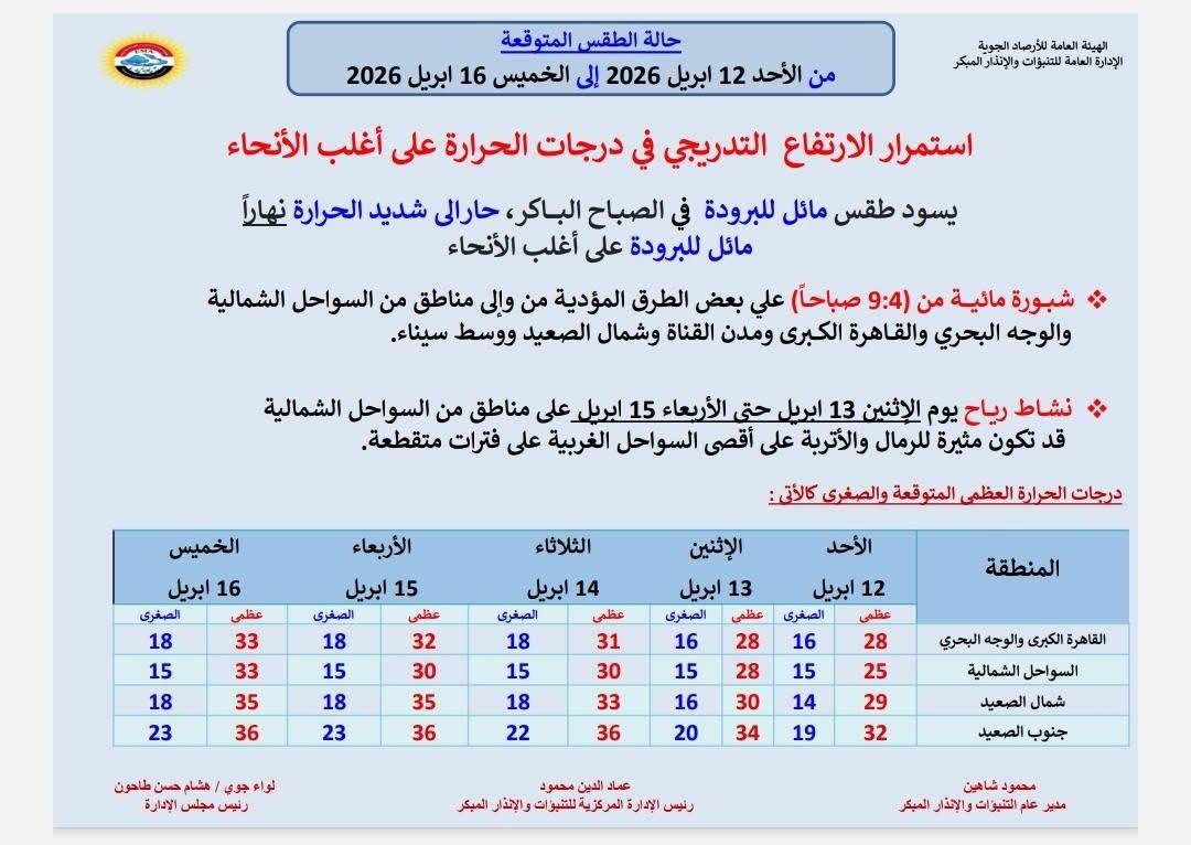 حالة الطقس غدًا الأحد 12 أبريل.. تشهد حالة الطقس خلال الأيام المقبلة تغيرات ملحوظة، حيث أعلنت الهيئة العامة للأرصاد الجوية استمرار الارتفاع التدريجي في درجات الحرارة على أغلب الأنحاء، بداية من غدٍ الأحد الموافق 12 أبريل 2026 وحتى الخميس 16 أبريل، مع أجواء مائلة للبرودة في الصباح الباكر، تتحول إلى حارة نهارًا على معظم المناطق، بينما تعود الأجواء لتكون مائلة للبرودة خلال فترات الليل، خاصة على السواحل الشمالية والوجه البحري والقاهرة الكبرى.