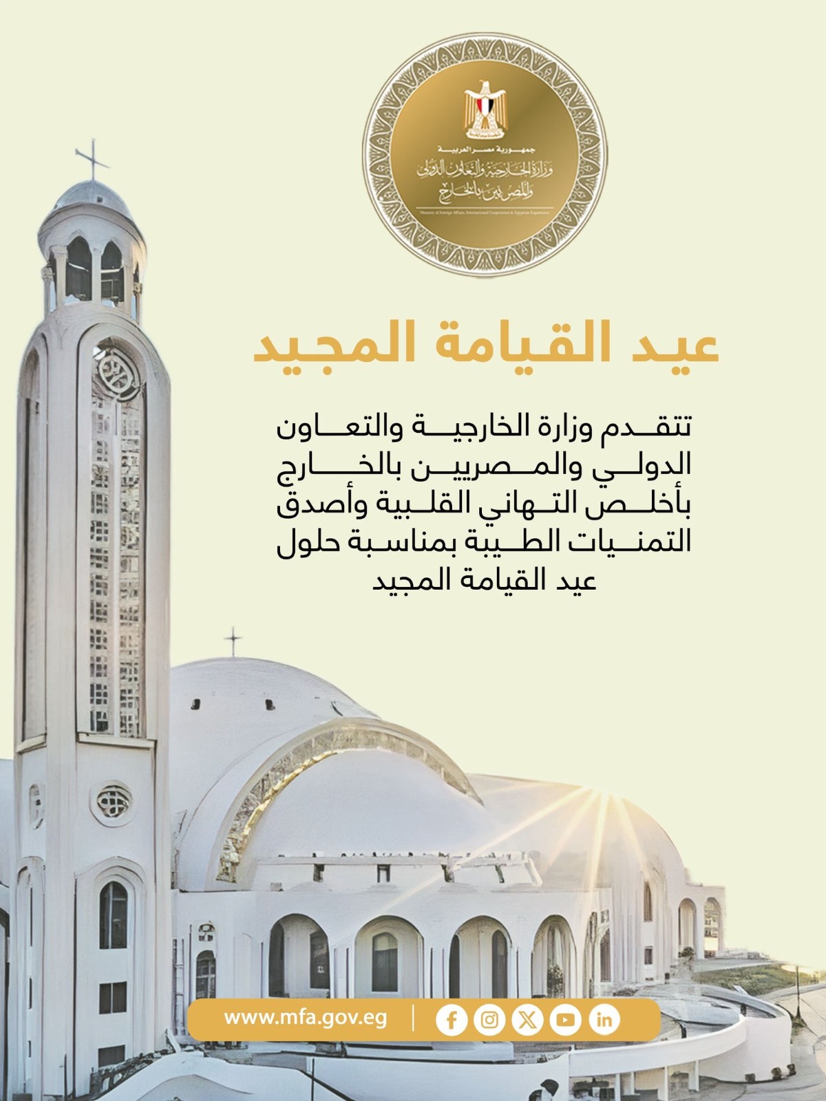 تقدمت وزارة الخارجية والتعاون الدولي والمصريين بالخارج بأخلص التهاني القلبية وأصدق التمنيات الطيبة إلى الشعب المصري، وخاصة الإخوة الأقباط، بمناسبة حلول عيد القيامة المجيد.