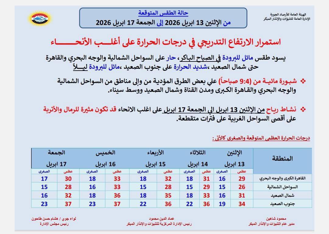تؤكد التوقعات استمرار الارتفاع التدريجي في درجات الحرارة خلال الفترة من الإثنين 13 أبريل وحتى الجمعة 17 أبريل على أغلب أنحاء الجمهورية، مع نشاط للرياح على فترات متقطعة، وقد تكون مثيرة للرمال والأتربة خاصة على أقصى السواحل الغربية.