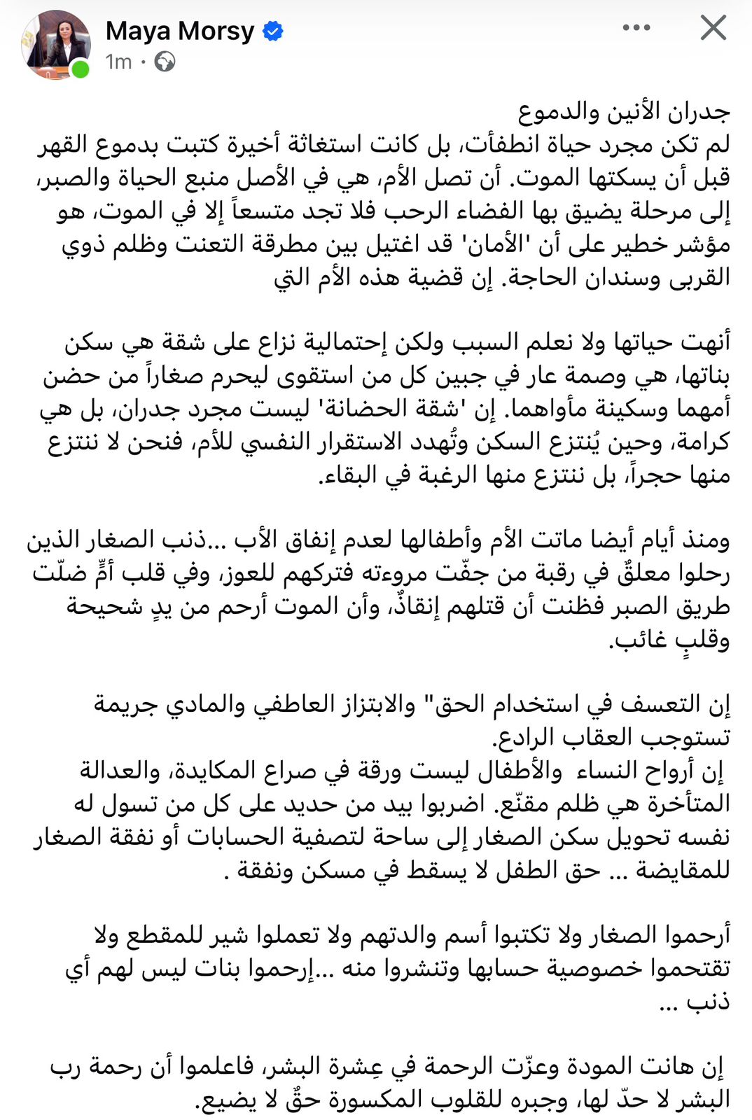 وقالت مرسي إن هذه الأم أنهت حياتها بسبب احتمال وجود نزاع على الشقة التي تعيش فيها مع بناتها وأكدت أن شقة الحضانة ليست مجرد جدران، بل هي كرامة واستقرار للأم، وأن انتزاع السكن منها هو انتزاع لرغبتها في الحياة، واصفة حرمان الصغار من مأواهم بأنه وصمة عار.
