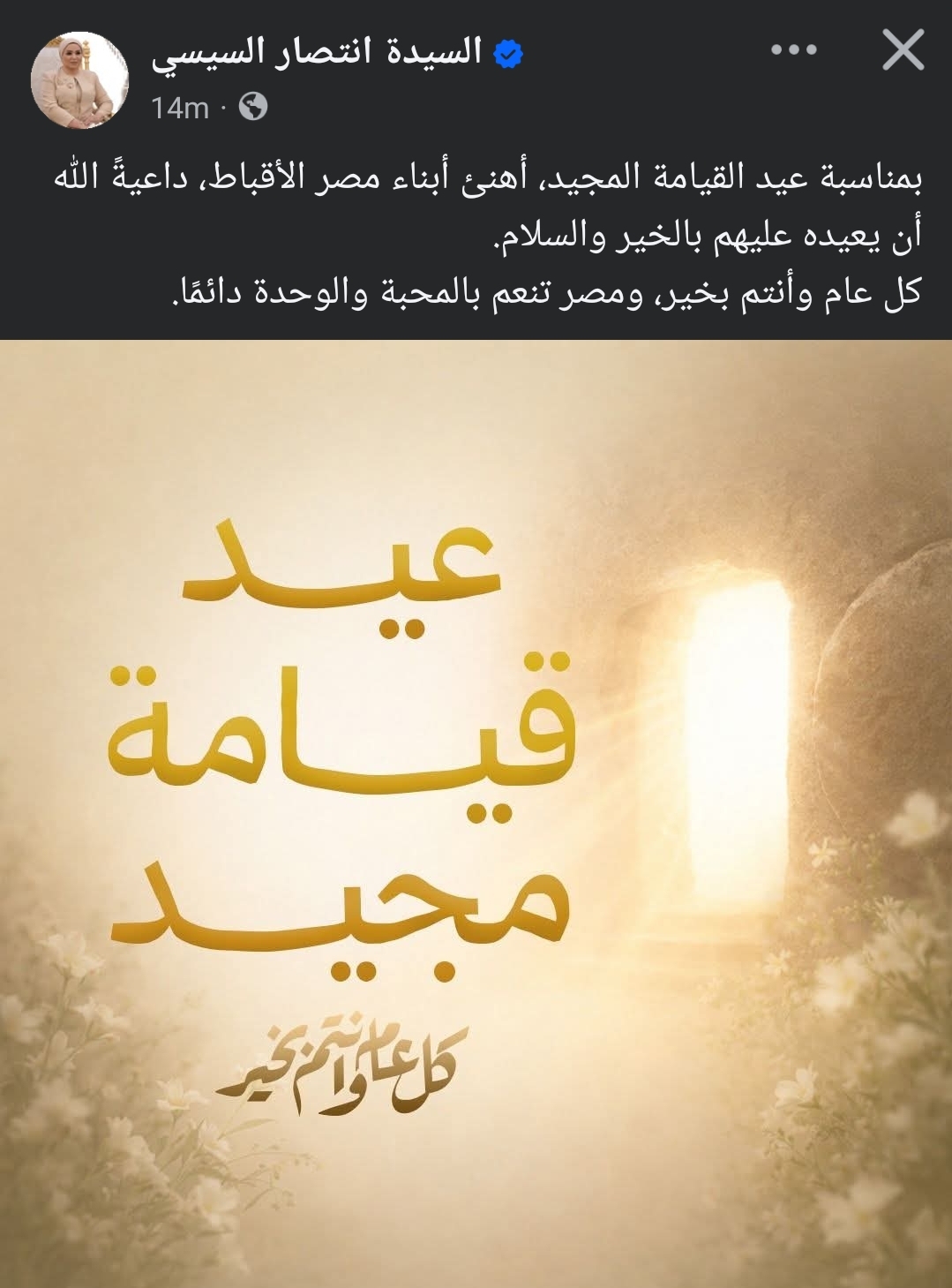 انتصار السيسي: نهنئ أبناء مصر الأقباط بعيد القيامة المجيد وندعو بدوام المحبة والسلام
