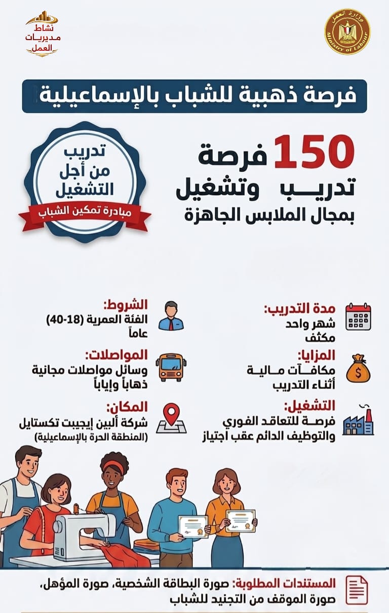"عمل الإسماعيلية" تُعلن عن 150 فرصة تدريب وتشغيل بمجال الملابس الجاهزة