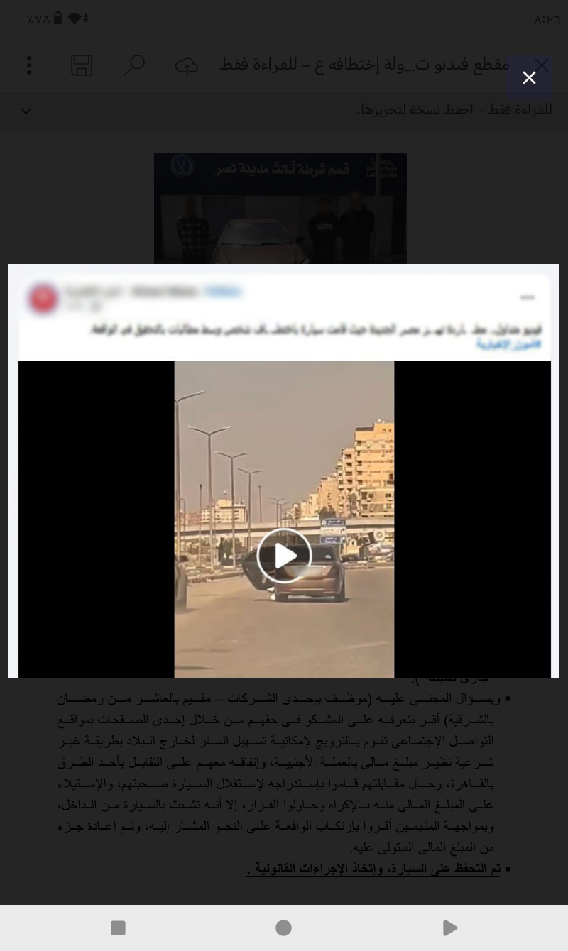 وبالفحص تبين أنه بتاريخ 12/ الجارى وأثناء تواجد قوة أمنية تابعة لقسم شرطة ثالث مدينة نصر والمعينة لملاحظة الحالة الأمنية بدائرة القسم، تلاحظ لها استغاثة أحد الأشخاص حال تشبثه بسيارة "ملاكى"، فقامت القوة الأمنية بملاحقة السيارة المشار إليها وأمكن استيقافها وتحرير المجنى عليه وضبط (3 من مستقليها وهروب آخر "جارى ضبطه").