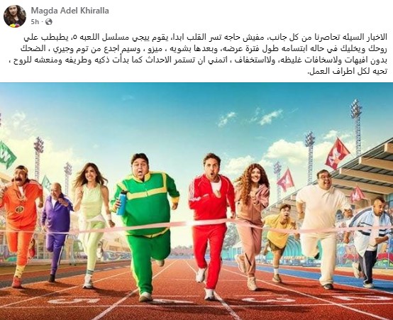 وكتبت ماجدة خير الله من خلال حسابها الرسمي عبر موقع التواصل الاجتماعي فيسبوك: الاخبار السيئه تحاصرنا من كل جانب، مفيش حاجه تسر القلب ابدا، يقوم ييجي مسلسل اللعبه ٥، يطبطب علي روحك ويخليك في حاله ابتسامه طول فترة عرضه.