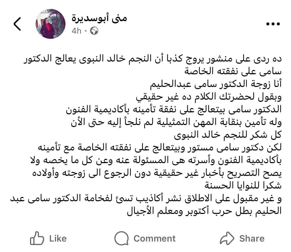 وحرصت منى أبو سديرة على الرد على تلك الشائعات، وكتبت من خلال حسابها الرسمي عبر موقع التواصل الاجتماعي فيسبوك، وقالت: ده ردى على منشور يروج كذبا أن النجم خالد النبوى يعالج الدكتور سامى على نفقته الخاصة.