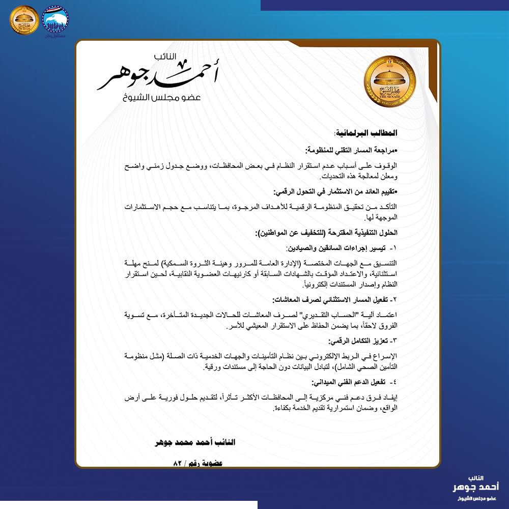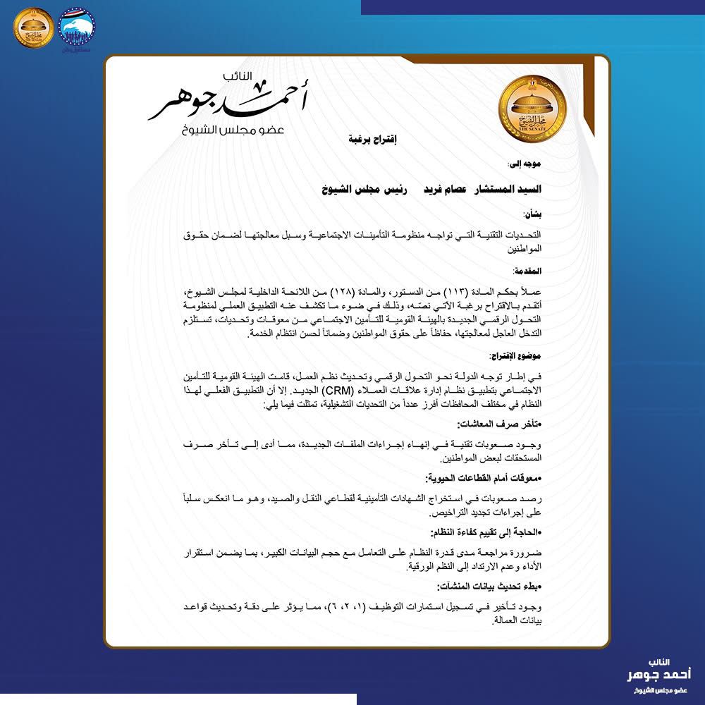 في تحرك برلماني جديد يسلط الضوء على أزمة تأخر صرف المعاشات وتعطل بعض الخدمات التأمينية، تقدم أحمد جوهر باقتراح برغبة إلى رئيس مجلس الشيوخ، لمواجهة التحديات التي ظهرت عقب تطبيق نظام التحول الرقمي الجديد داخل منظومة التأمينات الاجتماعية.