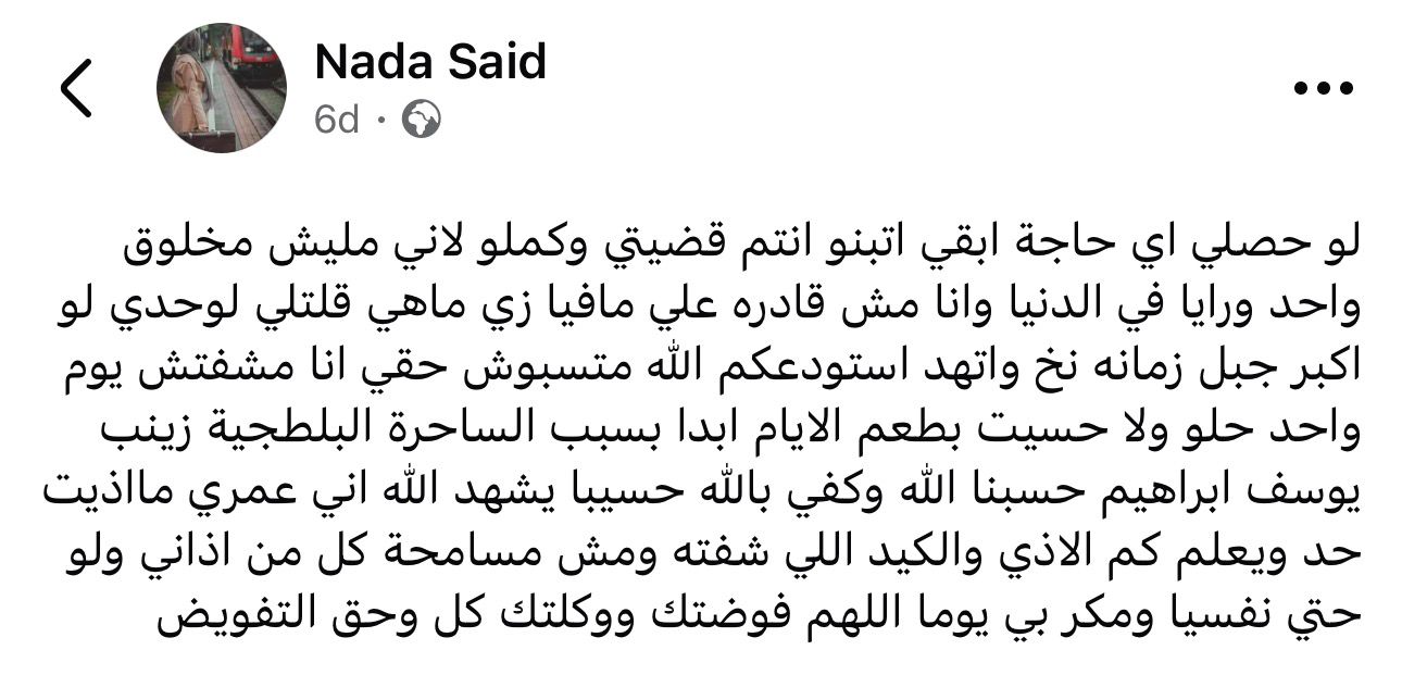 وقالت ندى: لو حصلي اي حاجة ابقي اتبنو انتم قضيتي وكملو لاني مليش مخلوق واحد ورايا في الدنيا وانا مش قادره علي مافيا زي ماهي قلتلي لوحدي لو اكبر جبل زمانه نخ واتهد استودعكم الله متسبوش حقي انا مشفتش يوم واحد حلو ولا حسيت بطعم الايام ابدا بسبب الساحرة البلطجية زينب يوسف ابراهيم حسبنا الله وكفي بالله حسيبا يشهد الله اني عمري مااذيت حد ويعلم كم الاذي والكيد اللي شفته ومش مسامحة كل من اذاني ولو حتي نفسيا ومكر بي يوما اللهم فوضتك ووكلتك كل وحق التفويض.