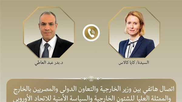 جرى اتصال هاتفى بين د. بدر عبد العاطي وزير الخارجية والتعاون الدولى والمصريين بالخارج والسيدة "كايا كالاس" الممثلة العليا للشئون الخارجية والسياسة الأمنية للاتحاد الأوروبي، يوم الاثنين ١٣ إبريل، في إطار التشاور المستمر لمناقشة سبل خفض التصعيد العسكرى فى المنطقة.
