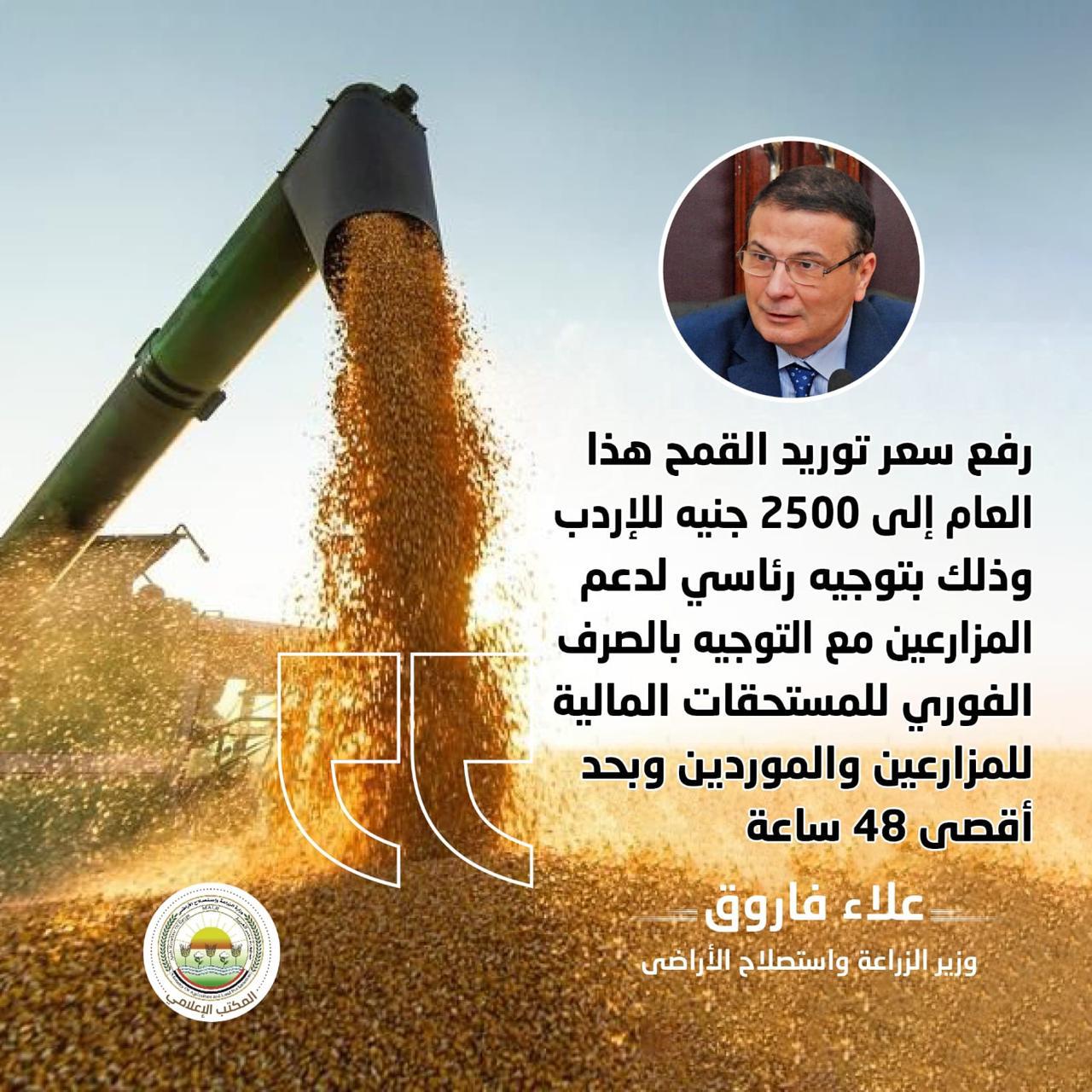 وأكد وزير الزراعة حرص الدولة على دعم الفلاح المصري، وتشجيعه، وضمان العائد المناسب له، وتحسين مستوى دخله، مشيرا إلى زيادة سعر توريد القمح هذا العام إلى 2500 جنيه للإردب، وذلك بتوجيه مباشر من فخامة الرئيس عبدالفتاح السيسي لدعم المزارعين، مع التوجيه بالصرف الفوري للمستحقات المالية للمزارعين والموردين، وبحد أقصى 48 ساعة، لافتاً إلى أن استقبال القمح المحلي سيبدأ من يوم 15 أبريل الجاري ويستمر حتى انتهاء الموسم في 15 أغسطس المقبل.