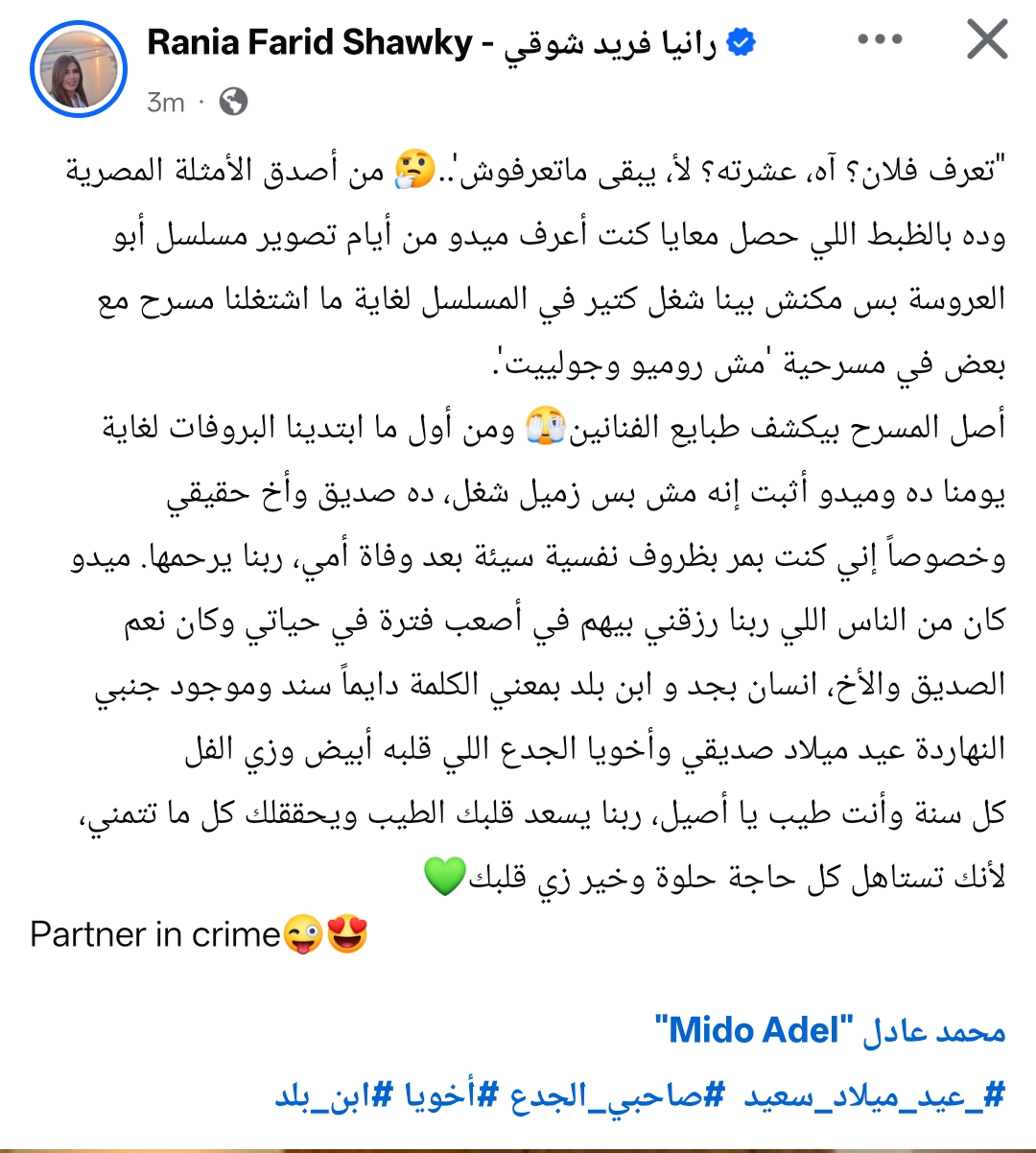 وكتبت رانيا فريد شوقي من خلال حسابها الرسمي عبر موقع التواصل الاجتماعي فيسبوك، قالت: "تعرف فلان؟ آه، عشرته؟ لأ، يبقى ماتعرفوش'.. من أصدق الأمثلة المصرية، وده بالظبط اللي حصل معايا كنت أعرف ميدو من أيام تصوير مسلسل أبو العروسة بس مكنش بينا شغل كتير في المسلسل لغاية ما اشتغلنا مسرح مع بعض في مسرحية 'مش روميو وجولييت'.
