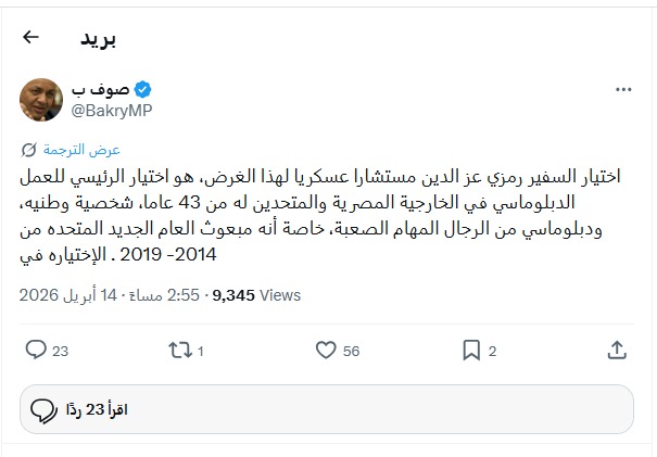 وقال بكري عبر حسابه على منصة إكس: «اختيار السفير رمزي عز الدين مستشارا سياسيا للرئيس السيسي هو اختيار لشخصية عملت في العمل الدبلوماسي في الخارجية المصرية والأمم المتحدة لأكثر من ٤٣ عاما»،
