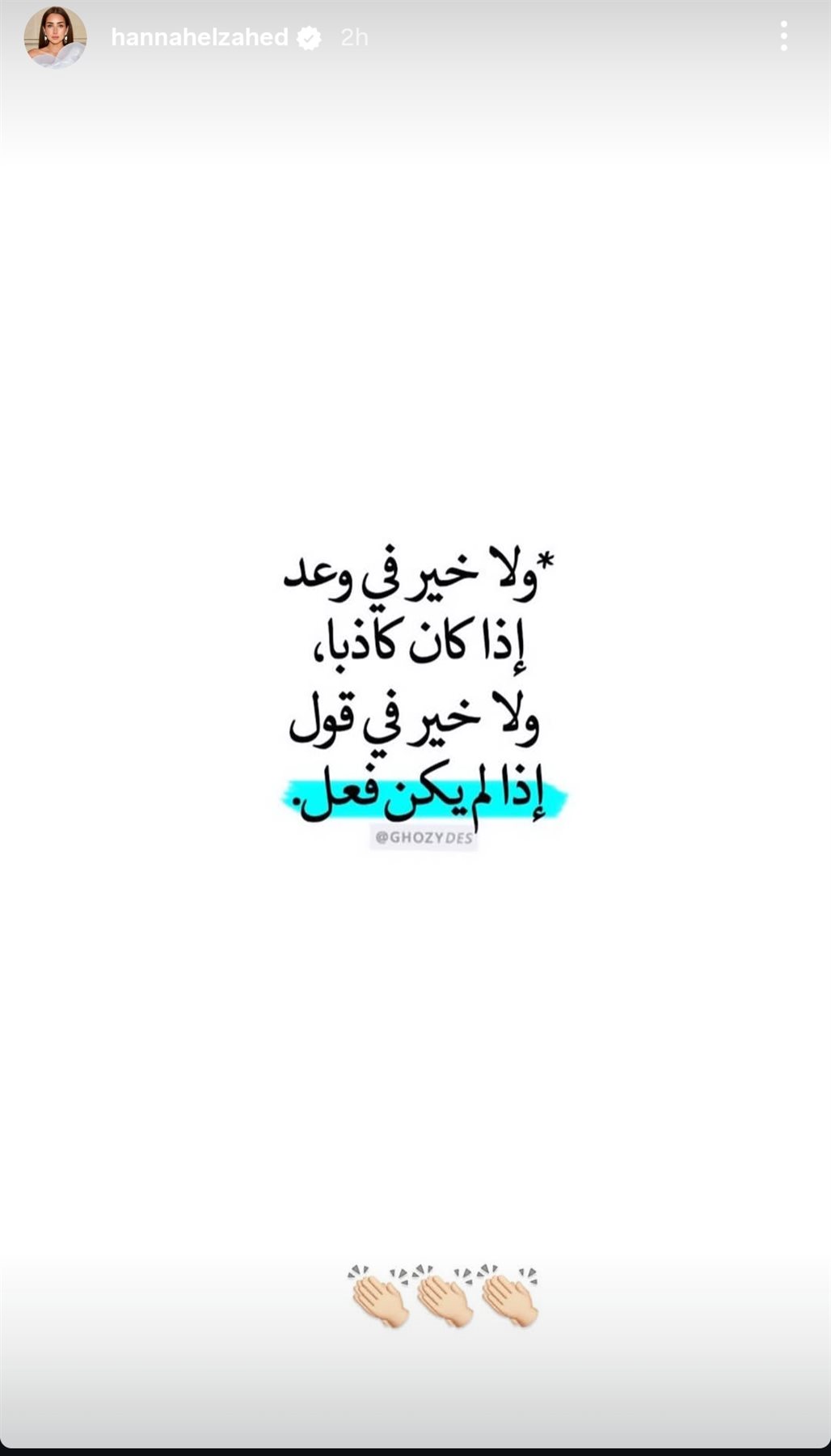 وكتبت هنا الزاهد من خلال حسابها الرسمي عبر موقع تبادل الصور والفيديوهات القصيرة إنستجرام، عبر خاصية ستوري، قالت: لا خيرًا في وعد إن كان كاذبًا، ولا خيرًا في قول إذا لم يكن فعل.