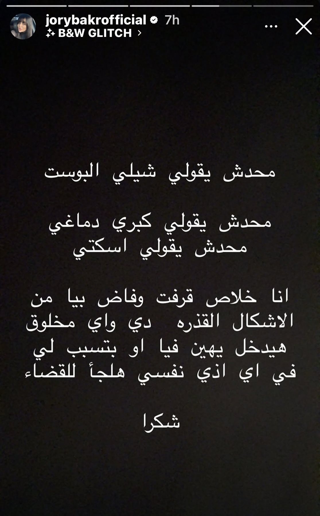 ووجهت جوري بكر، عبر حسابها الرسمي بموقع تداول الصور والفيديوهات «إنستجرام»، رسالة حادة تتضمن الأتي: «أي مخلوق هيدخل يهينّي أو يتسبب لي في أذى نفسي هلجأ للقضاء، وشكرًا».