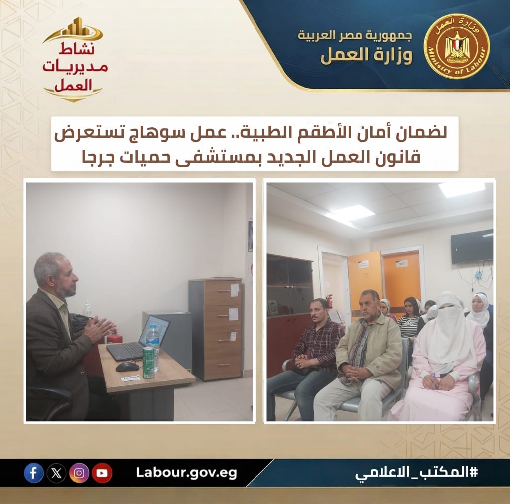 تنفيذًا لتوجيهات وزير العمل حسن رداد، نظمت مديرية عمل سوهاج، بإشراف محمد صلاح محمد، ندوة بمستشفى حميات جرجا حول السيطرة على مخاطر بيئة العمل الصحية. وتناولت الندوة الفوارق بين قانون العمل السابق والحالي لرفع الكفاءة الوقائية وحماية الأطقم الطبية من إصابات العمل.