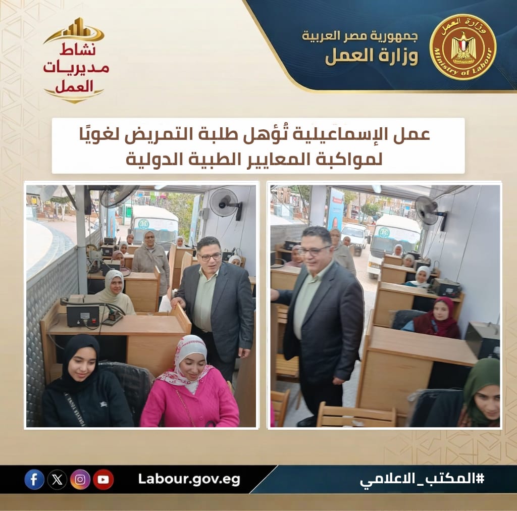 تنفيذًا لتوجيهات وزير العمل حسن رداد، افتتحت مديرية عمل الإسماعيلية، بقيادة الدكتور أيمن شعبان، دورة تدريبية لطلبة التمريض عبر الوحدة المتنقلة. وتهدف الدورة لتمكين الكوادر الشابة من المصطلحات الطبية الدولية لضمان التواصل الفعال وتقديم خدمات طبية بجودة عالمية بالمحافظة.