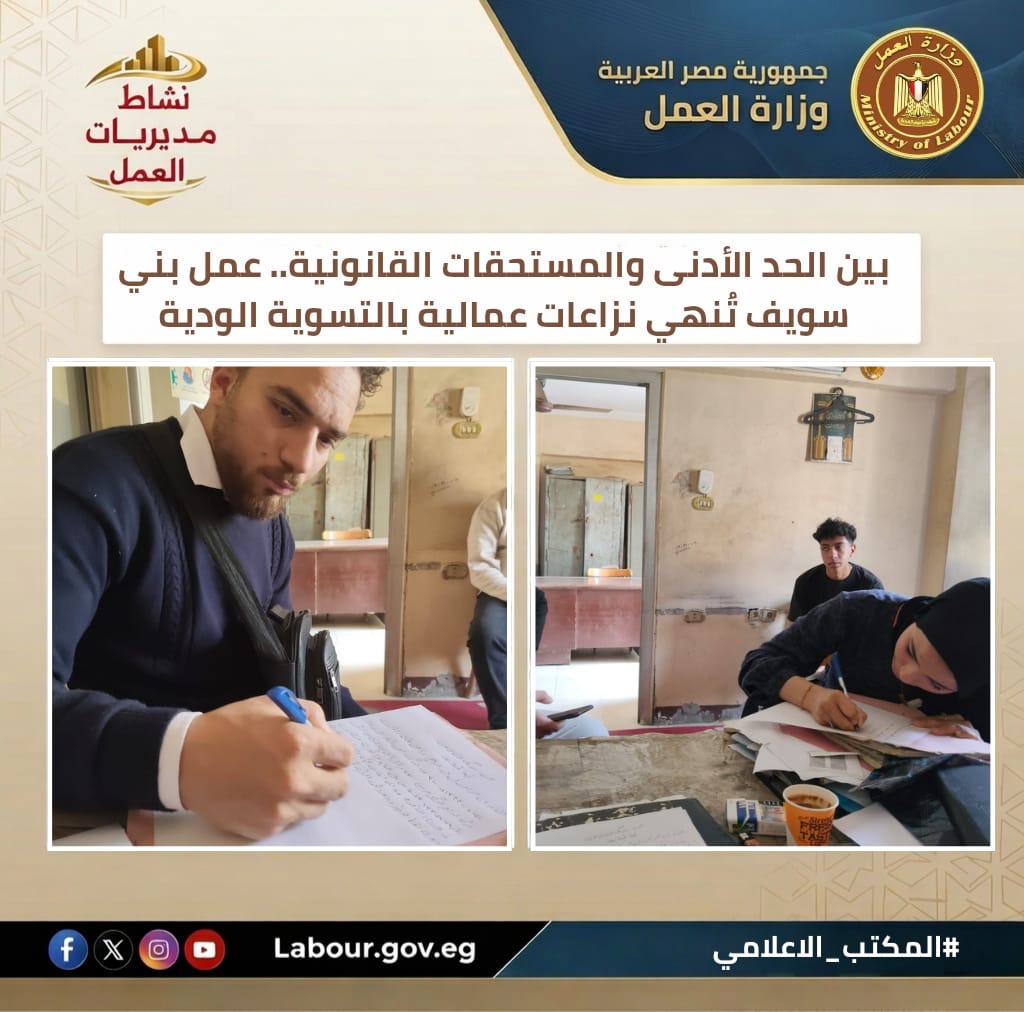 3. "عمل بني سويف" تُنهي نزاعات عمالية وتسترد مستحقات قانونية ودياً