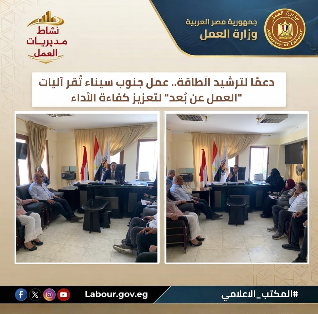 تنفيذًا لتوجيهات وزير العمل حسن رداد، عقد أكرم محمد سيد أحمد، مدير مديرية عمل جنوب سيناء، اجتماعاً لتفعيل نظام "العمل عن بُعد" أيام الأحد خلال شهر أبريل. وشدد الاجتماع على ضرورة ترشيد الطاقة داخل المقرات الحكومية مع ضمان استدامة جودة الخدمات المقدمة للمواطنين ومواكبة التحول الرقمي.