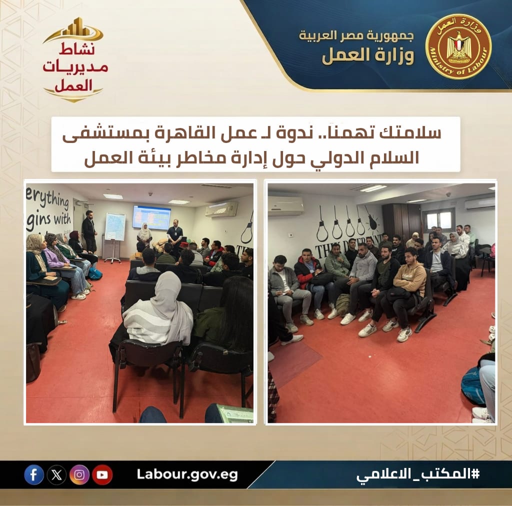تنفيذًا لتوجيهات وزير العمل حسن رداد، نظمت مديرية عمل القاهرة، بقيادة سيد الشرقاوي مدير المديرية ، ندوة توعوية بمستشفى السلام الدولي ضمن مبادرة "سلامتك تهمنا". وتناولت الندوة سبل حماية الكوادر الطبية من الإصابات وآليات تنفيذ خطط الإخلاء، لتحويل الوعي الوقائي إلى سلوك مؤسسي يضمن مناخ عمل آمن.