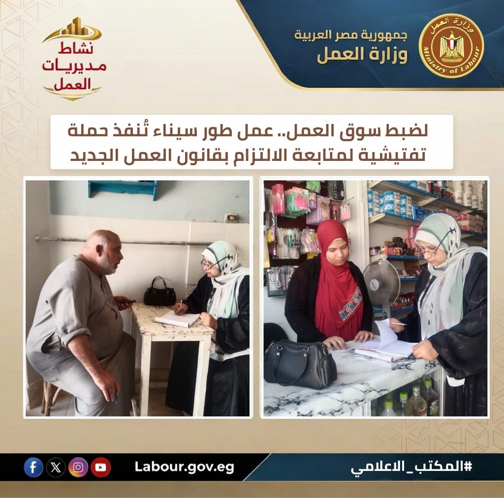 تنفيذًا لتوجيهات وزير العمل حسن رداد، أطلقت مديرية عمل جنوب سيناء، بقيادة أكرم محمد سيد أحمد، حملة تفتيشية لمراقبة تنفيذ أحكام قانون العمل رقم 14 لسنة 2026. واستهدفت الحملة التأكد من ممارسة الحقوق والواجبات المتبادلة بين طرفي الإنتاج وتقديم إرشادات لخلق بيئة عمل صحية ومستقرة.