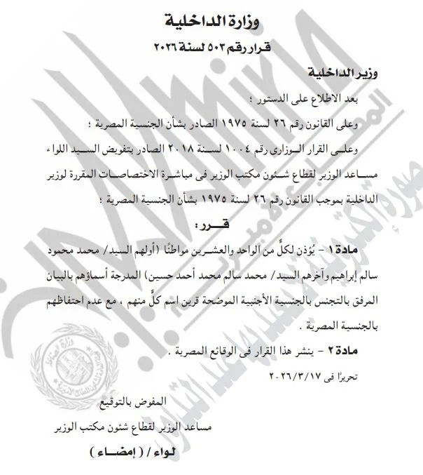 نشرت الجريدة الرسمية اليوم، قرار وزارة الداخلية بالإذن لـ21 شخصا بالتجنس بجنسيات أجنبية، مع عدم احتفاظهم بالجنسية المصرية.
