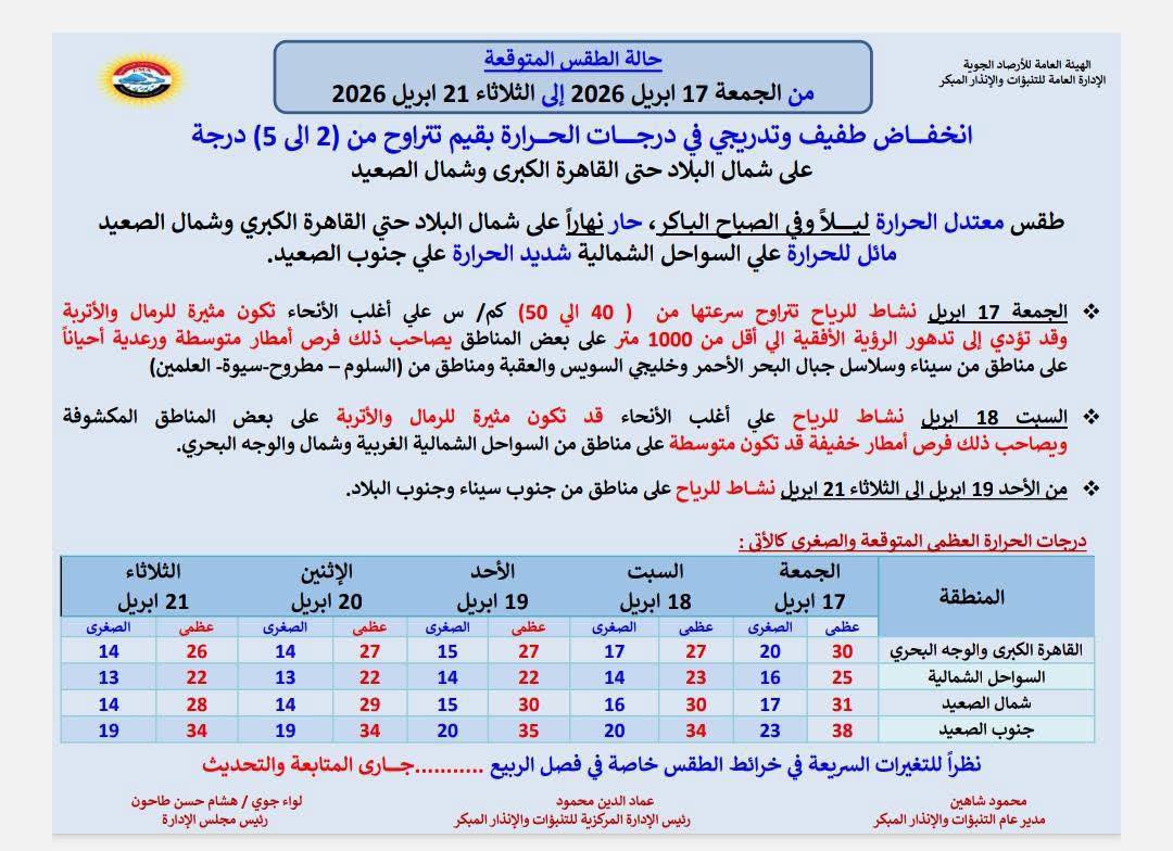 حالة الطقس غدًا الجمعة 17 أبريل 2026.. تشهد حالة الطقس غدًا الجمعة 17 أبريل 2026، تغيرات ملحوظة على أغلب أنحاء الجمهورية، حيث أعلنت الهيئة المختصة بالتنبؤات الجوية عن انخفاض طفيف وتدريجي في درجات الحرارة، بالتزامن مع نشاط ملحوظ للرياح المثيرة للرمال والأتربة وفرص لسقوط الأمطار على عدد من المناطق، في ظل أجواء ربيعية متقلبة تتطلب متابعة مستمرة لحالة الطقس خلال الأيام المقبلة.