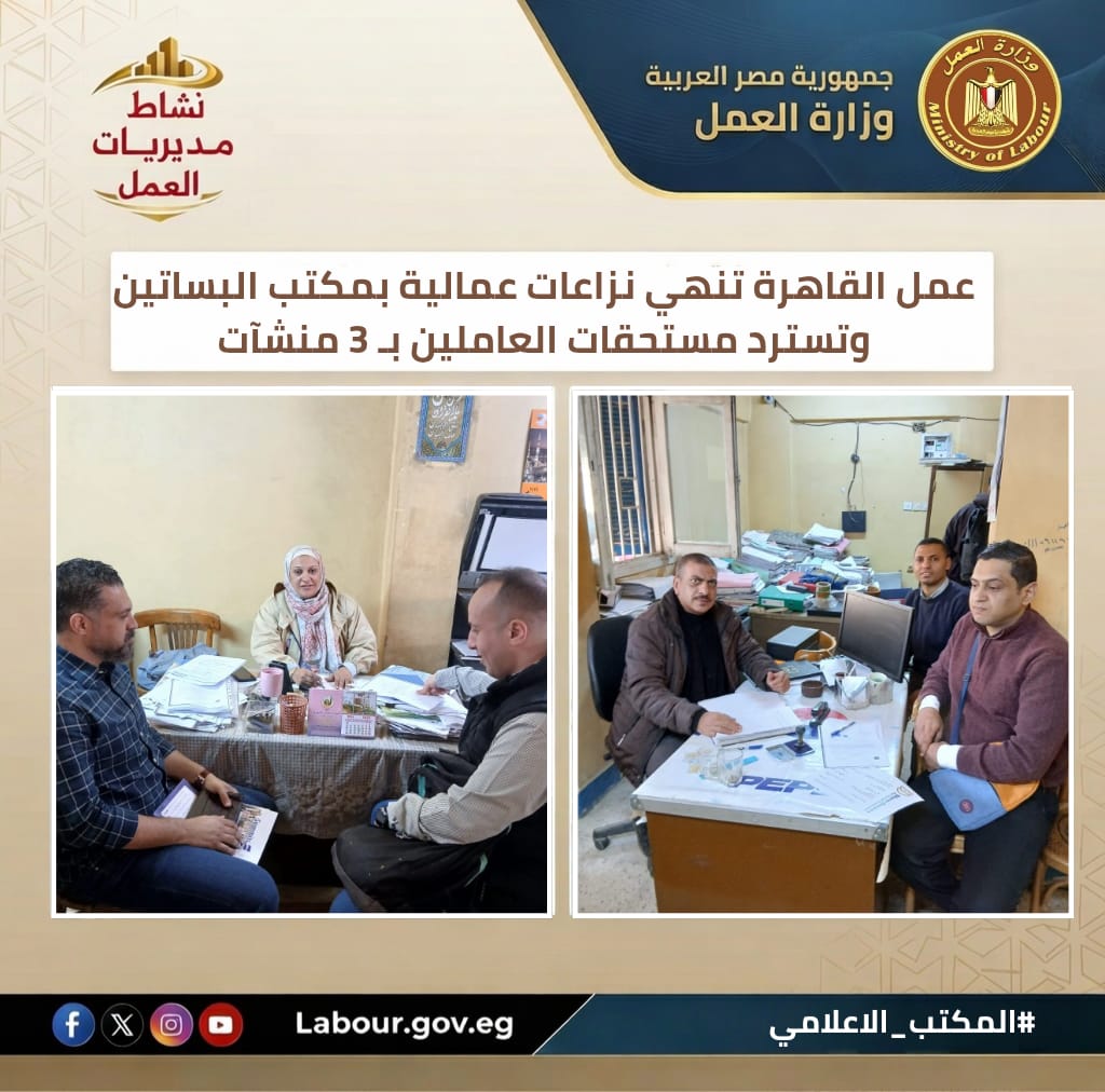 تنفيذًا لتوجيهات وزير العمل حسن رداد، نجحت مديرية عمل القاهرة في إتمام تسويات ودية لصالح عاملين بمدرسة دولية وشركات خاصة بالبساتين. وأسفرت الجهود عن حصول الشاكين على كامل مستحقاتهم المالية ورصيد إجازاتهم، مما يسهم في سرعة إنجاز الشكاوى ودعم مناخ الاستثمار بالعاصمة.