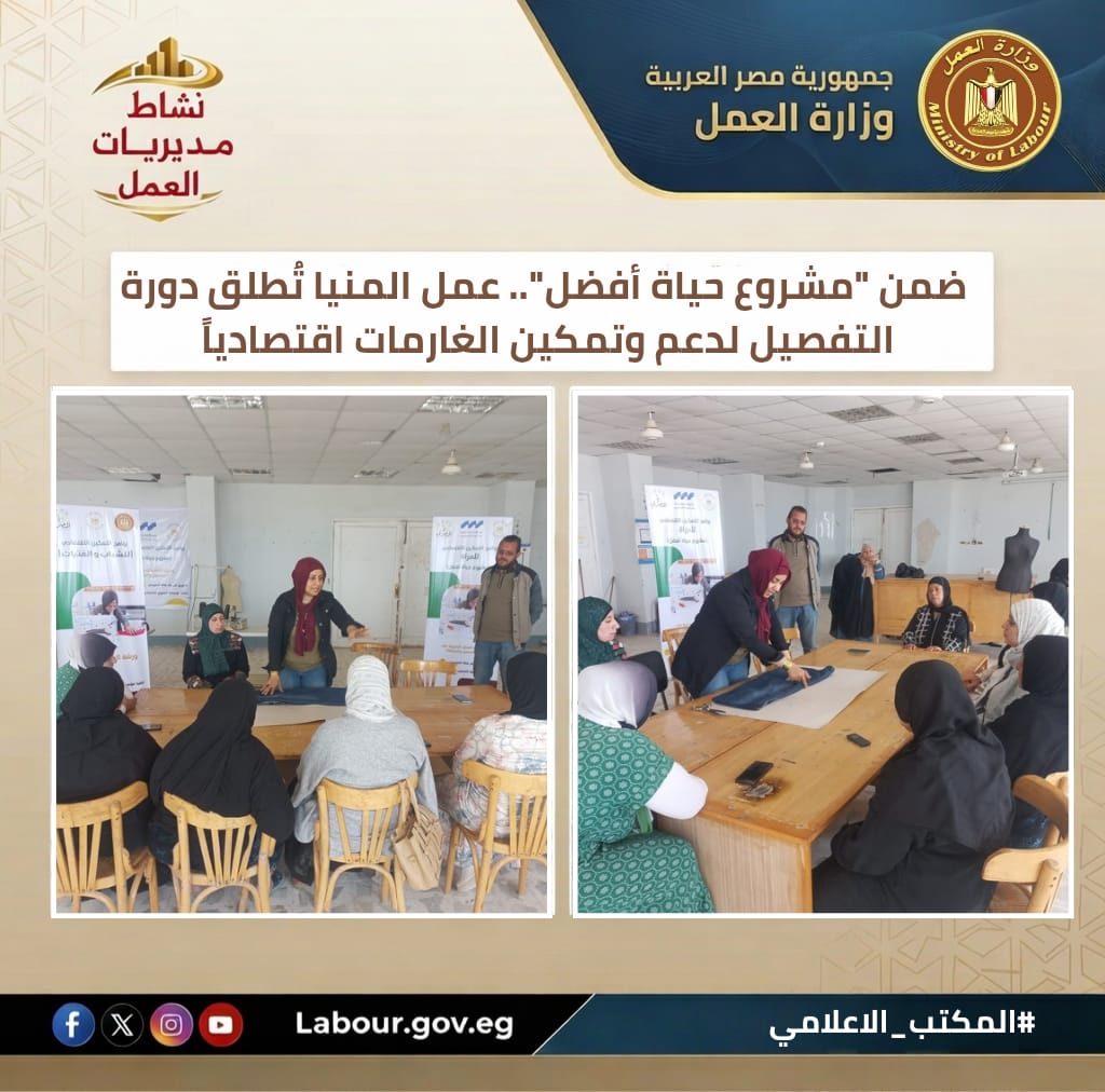 تنفيذًا لتوجيهات وزير العمل حسن رداد، افتتحت مديرية عمل المنيا دورة تدريبية لتمكين السيدات الغارمات بمركز التدريب المهني بالمنطقة الصناعية. وتشمل المبادرة تسليم المتدربات حقائب إنتاجية (ماكينات خياطة ومعدات) ومنحاً مالية لبدء مشروعاتهن الخاصة لتحقيق استقلال مادي مستدام.