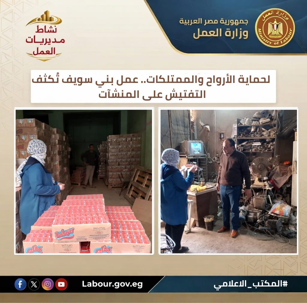 تنفيذًا لتوجيهات وزير العمل حسن رداد، أطلقت مديرية عمل بني سويف، بقيادة المهندس أحمد العربي، حملة تفتيشية على المنشآت والورش أسفل الأبراج السكنية. واستهدفت الحملة مراجعة اشتراطات السلامة المهنية وفق القانون الجديد للحد من الإصابات والحفاظ على سلامة السكان والعاملين.