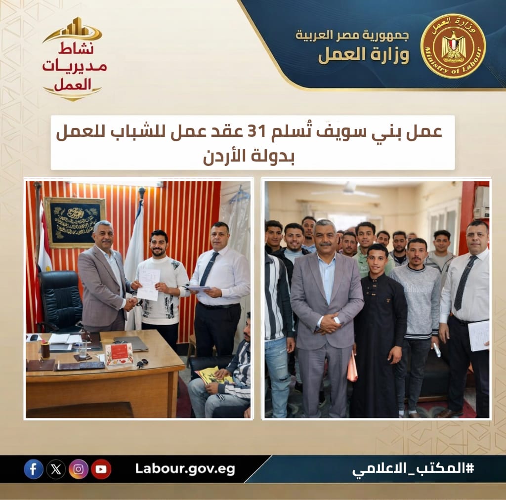 15. تسليم 31 عقد عمل للشباب بدولة الأردن من أبناء بني سويف