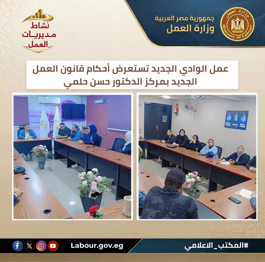 تنفيذًا لتوجيهات وزير العمل حسن رداد، نظمت مديرية عمل الوادي الجديد، بقيادة أسامة إبراهيم، ندوة تثقيفية بمدينة الخارجة لشرح مستجدات قانون العمل الجديد. وتناولت الندوة آليات التوازن بين طرفي الإنتاج، بالإضافة إلى شق توعوي حول "تنظيم الأسرة" لتعزيز الاستقرار الاجتماعي للعاملين.