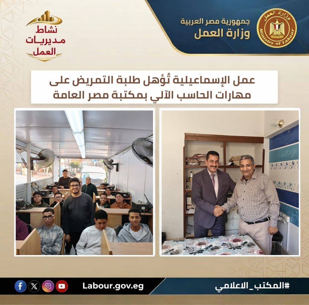 تنفيذًا لتوجيهات وزير العمل حسن رداد، افتتح الدكتور أيمن شعبان، مدير مديرية عمل الإسماعيلية، دورة "الحاسب الآلي" لطلبة التمريض عبر الوحدة المتنقلة. وتهدف الدورة لرفع الكفاءة التقنية للكوادر الطبية الشابة وإكسابهم المهارات اللازمة للتعامل مع المنظومات الصحية الحديثة.