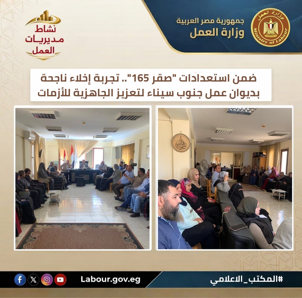 2. تجربة إخلاء ناجحة بديوان "عمل جنوب سيناء" لتعزيز الجاهزية للأزمات