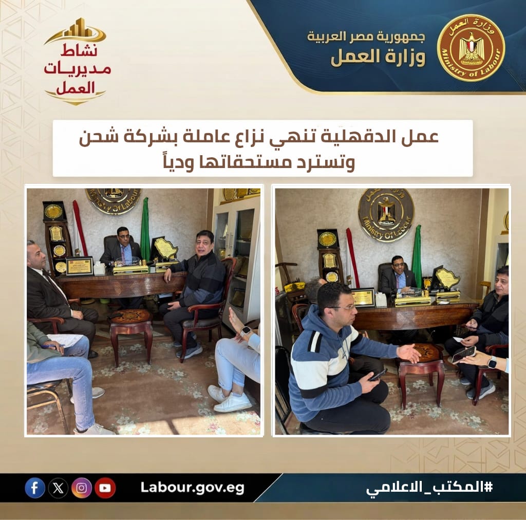 11. "عمل الدقهلية" تنهي نزاع عاملة بشركة شحن وتسترد مستحقاتها ودياً
