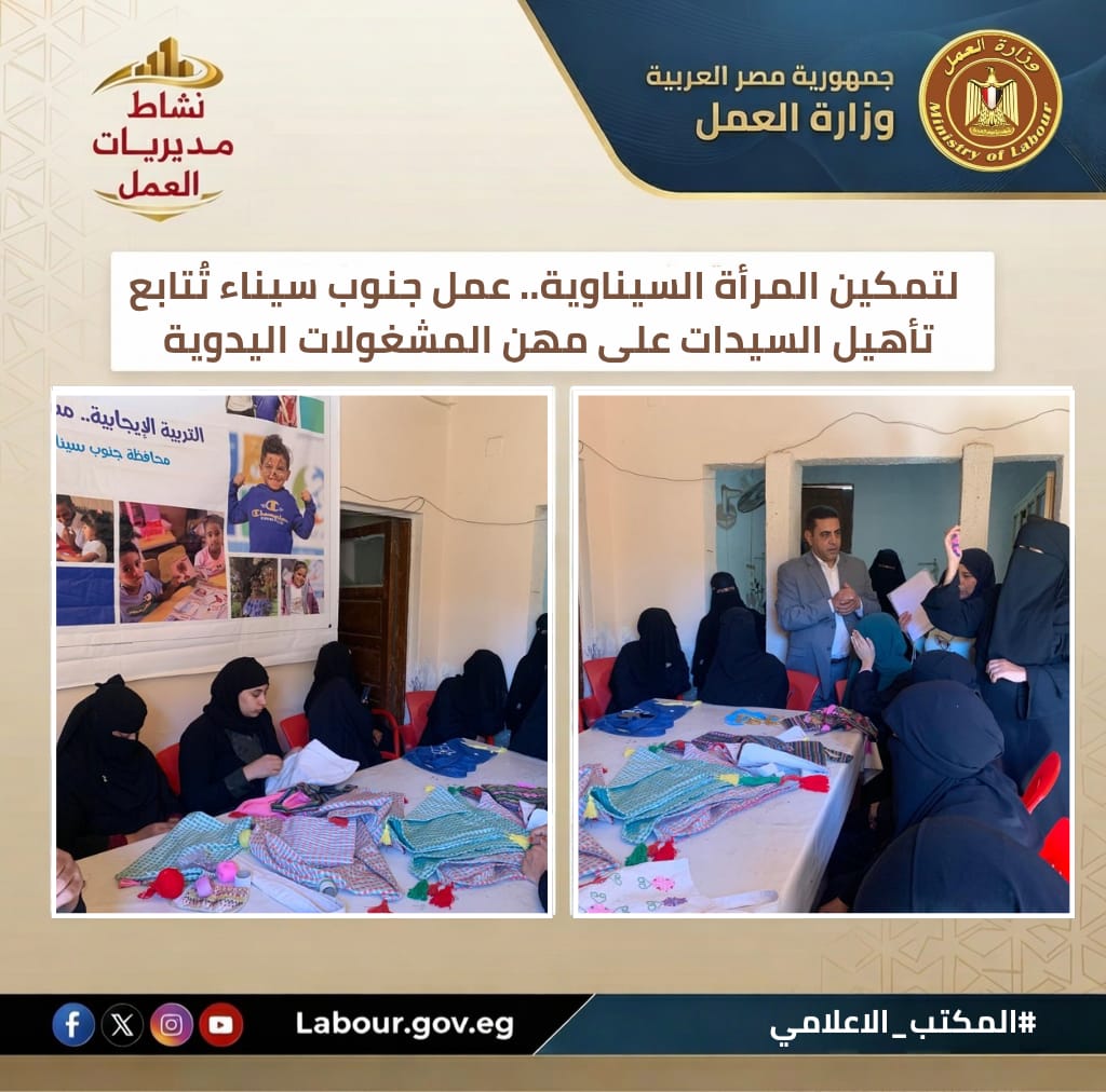 تنفيذًا لتوجيهات وزير العمل حسن رداد، تفقد أكرم محمد سيد أحمد، مدير مديرية عمل جنوب سيناء، الدورة التدريبية على الأشغال اليدوية بوحدة المرأة الريفية. وتستهدف الدورة دمج المرأة البدوية في سوق العمل والحفاظ على التراث السيناوي، وتحويل الطاقات النسائية إلى مشروعات إنتاجية مستدامة.