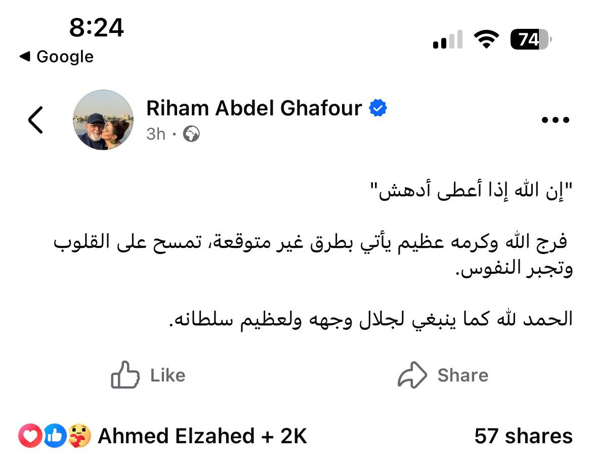 في لفتة إنسانية تحمل طابعًا روحانيًا، شاركت الفنانة ريهام عبد الغفور جمهورها بمنشور مؤثر عبر حسابها الرسمي على مواقع التواصل الاجتماعي، عبّرت من خلاله عن حالة من الامتنان واليقين.