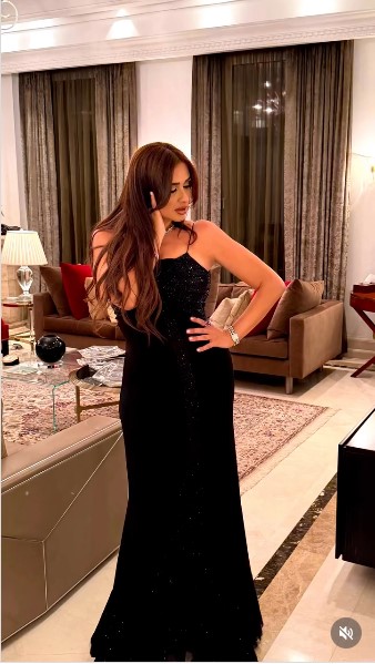وظهرت ياسمين عبد العزيز بفستان من اللون الأسود، وتركت شعرها منسدلًا على كتفيها، كما وضعت بعض مستحضرات التجميل التي أبرزت جمالها.