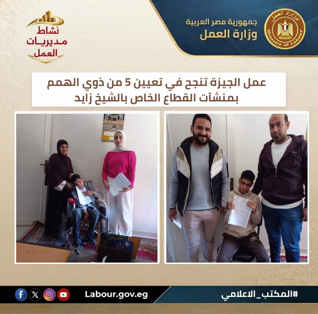 تنفيذًا لتوجيهات وزير العمل حسن رداد، أعلنت مديرية عمل الجيزة، عن توظيف 5 من ذوي الهمم عبر مكتب عمل الشيخ زايد. وتستهدف هذه الخطوة تفعيل نسبة الـ 5% المقررة قانوناً، ودمج ذوي الإعاقة في بيئة عمل آمنة ومحفزة تضمن لهم الاستقلال الاقتصادي والاجتماعي.