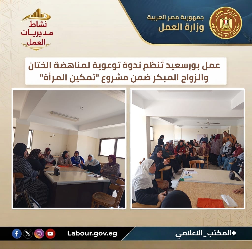 تنفيذًا لتوجيهات وزير العمل حسن رداد، نظمت مديرية عمل بورسعيد، بقيادة إيمان مسعد، ندوة توعوية لـ 50 متدربة بمشروع "دعم إدماج النوع الاجتماعي". وتستهدف الندوة رفع الوعي الصحي والقانوني بمخاطر الختان والزواج المبكر، بالتوازي مع التدريب المهني لتمكين المرأة اقتصادياً واجتماعياً.