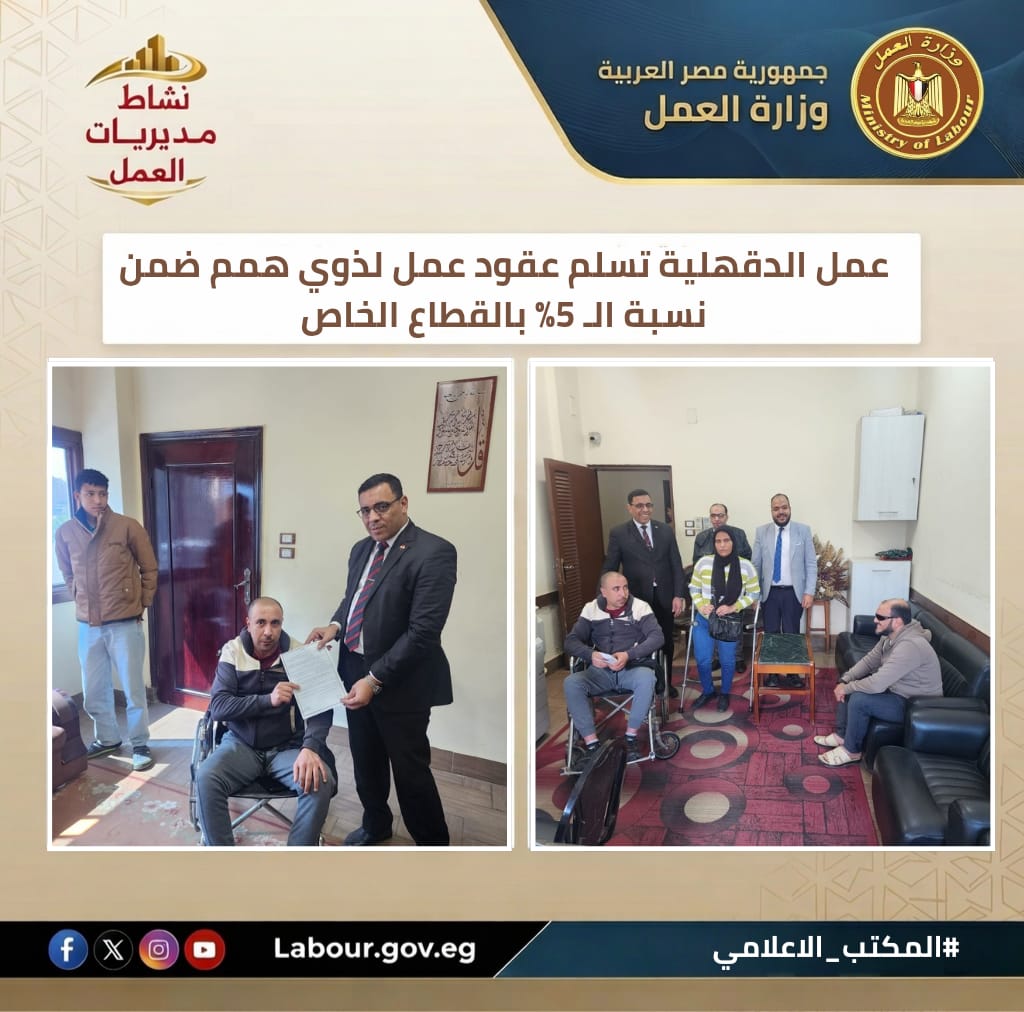 تنفيذًا لتوجيهات وزير العمل حسن رداد، سلمت مديرية عمل الدقهلية 3 عقود عمل رسمية لذوي همم بالقطاع الخاص، بعد تنسيق المديرية لتوفير فرص تتناسب مع حالتهم الصحية. وتستهدف الخطوة تفعيل قانون دمج ذوي الإعاقة في سوق العمل وضمان استقلالهم الاقتصادي من خلال وظائف لائقة ومستقرة.