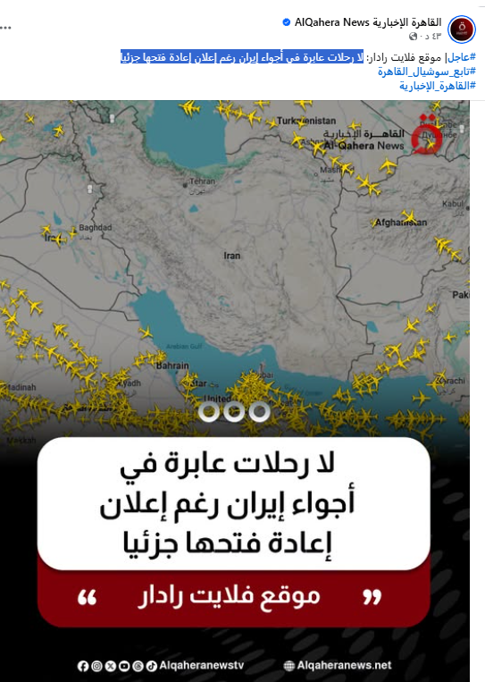وكانت إيران قد أعلنت مؤخرًا فتح جزء من مجالها الجوي أمام الملاحة الجوية بشكل محدود، في إطار إجراءات تدريجية لإعادة الاستقرار إلى حركة الطيران بعد اضطرابات أمنية وعسكرية شهدتها المنطقة، إلا أن هذا الإعلان لم ينعكس حتى الآن على حركة العبور الجوي الدولي.
