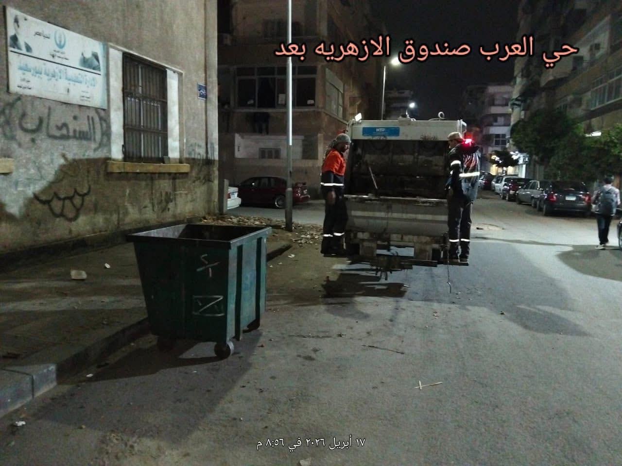 استمرار أعمال الوردية المسائية لرفع الأتربة وتجريف المخلفات بنطاق الحي