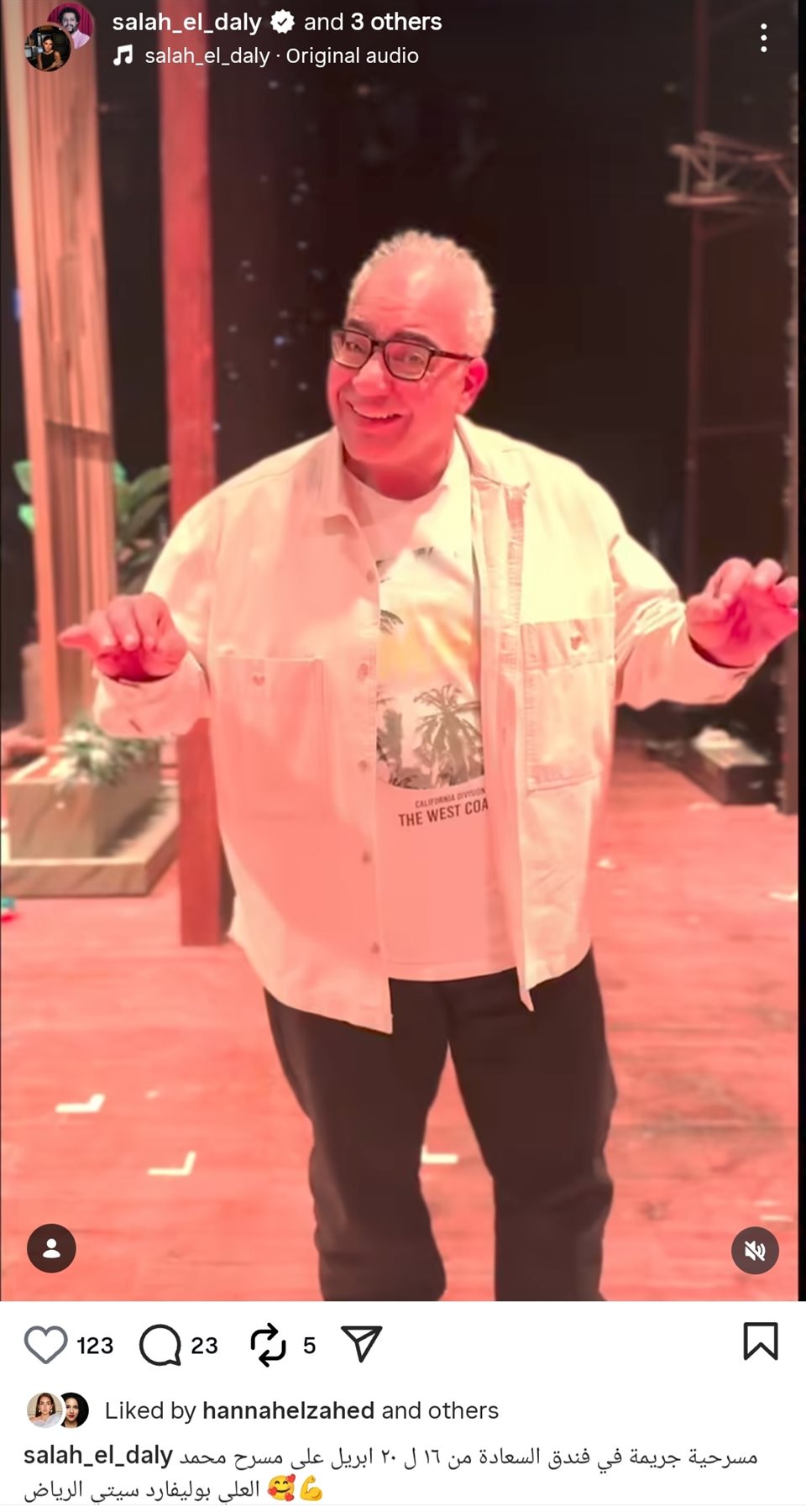 وكتب بيومي فؤاد من خلال حسابه الرسمي عبر موقع تبادل الصور والفيديوهات القصيرة إنستجرام، قال: مسرحية جريمة في فندق السعادة من 16 لـ 20 أبريل على مسرح محمد العلي بوليفارد موسم الرياض.