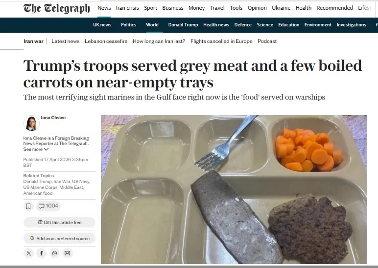 نشرت صحيفة “التليجراف” صورًا وصفتها بـ”الصادمة” لوجبات غذائية قيل إنها تُقدَّم لجنود الجيش الأميركي المشاركين في العمليات المرتبطة بحرب إيران، وسط حديث عن تراجع مستوى الإمدادات الغذائية داخل بعض القطع البحرية الأميركية.