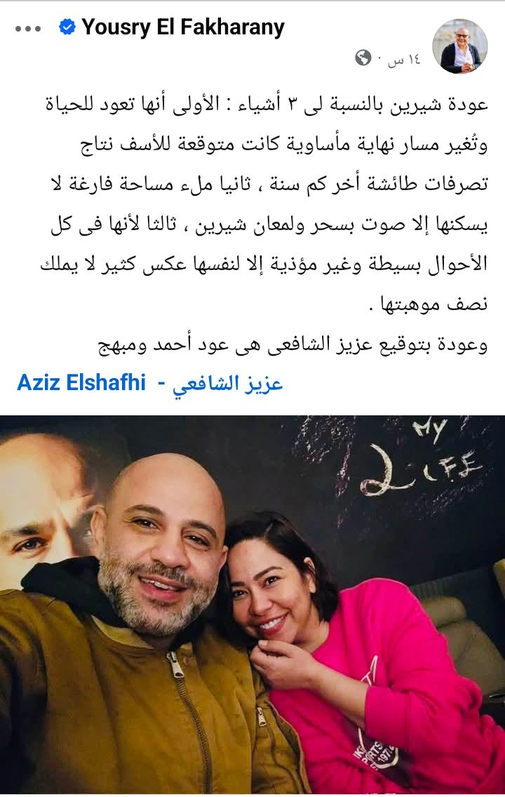 وأوضح الفخراني، عبر منشور له على “فيسبوك”، أن عودة شيرين تمثل له بداية جديدة تعيدها إلى الحياة بعد فترة كان يخشى أن تنتهي بشكل مأساوي بسبب بعض القرارات التي وصفها بغير الموفقة خلال السنوات الماضية.