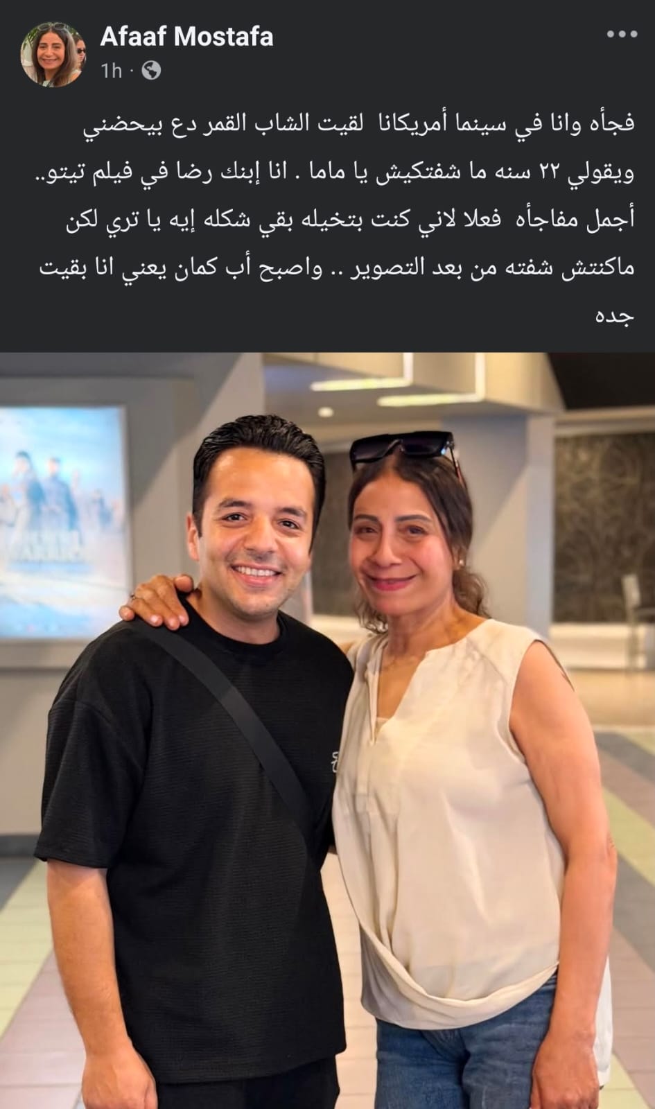 وكشفت عفاف مصطفى تفاصيل اللقاء عبر حسابها الرسمي على "فيسبوك"، حيث نشرت صورة تجمعها بالشاب، موضحة أنه فاجأها أثناء تواجدها داخل إحدى دور العرض، حين اقترب منها واحتضنها، مذكرًا إياها بدوره في الفيلم، قائلًا إنه "رضا" الذي قدّم شخصيتها كابنها خلال الأحداث.